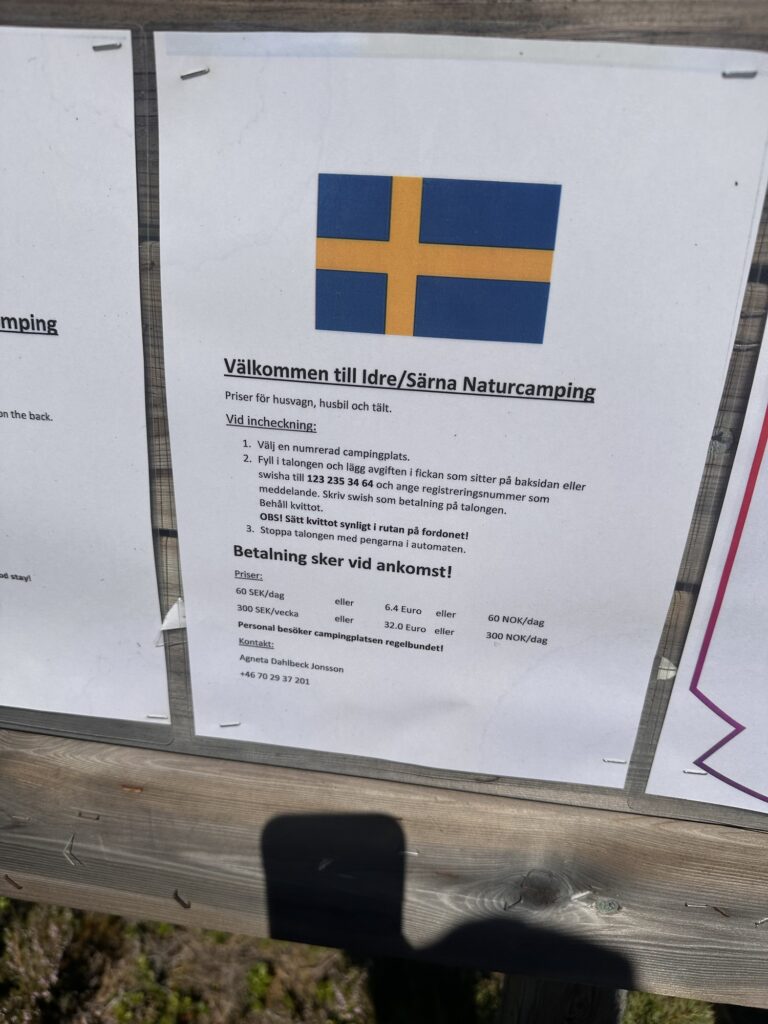 Platsen är bra uppmärkt med ”camping tomterna” och bra sortering för sopor. Man betalar 60 kronor per dag man står där och smidigast är att göra det med swisch.