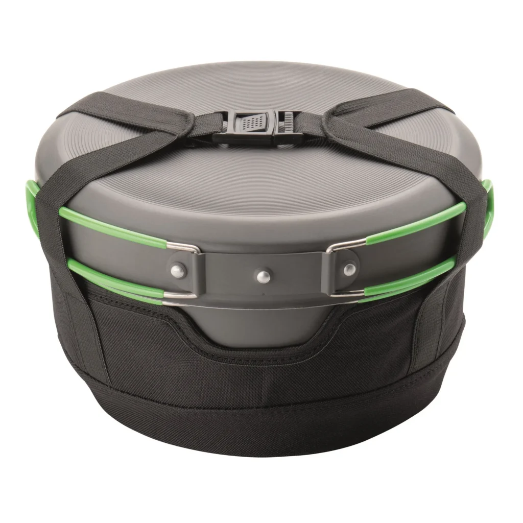Det består av två kastruller, en stekpanna ett lock som kan användas för att hälla av vatten med, samt ett silicon lock som man kan sätta över för att hålla maten varm, även en liten duk som ser till så inte stora kastrullen blir repad när man packar det. Allt kan staplas i varandra, jag får även plats med min Optimus Polaris i minsta kastrullen. Sen lägger man det i ett skyddande fodral som också följer med.